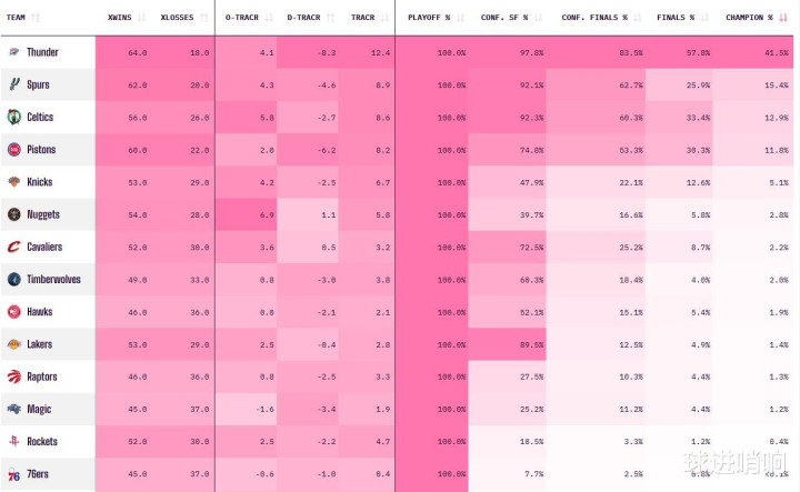4队超10%领跑:活塞(11.8%)、凯尔特人(12.9%)、马刺(15.4%)、雷霆(41.5%)